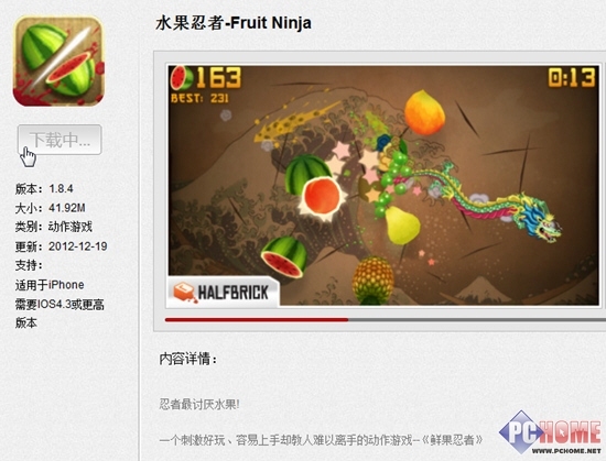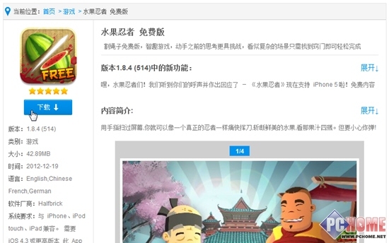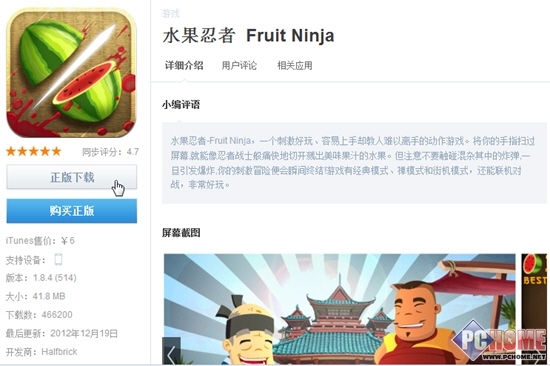 水果忍者一直是iOS平台特别火的老游戏,看看各平台手机助手的免越狱下载功能如何?是不是都能做到免费下载。
