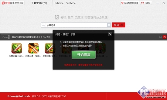 对于下载的正版应用出现闪退,或者弹出输入账号密码小窗的问题,PP助手提供修复功能和现象注解。