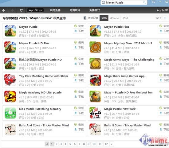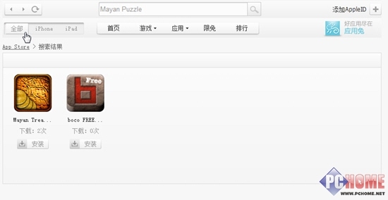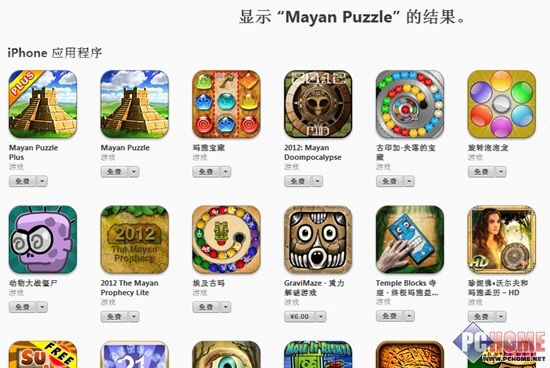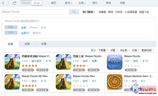 用户只要在App Store上方的搜索栏键入想要查找的应用名字,iTunes随即为用户显示全设备的,包含“Mayan Puzzle”的应用或者游戏。
