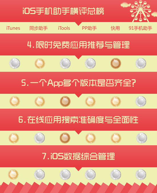 我们的评测到了榜单揭晓的时刻,在几个主要功能指标的比较评测下,虽然六款手机助手都各有优势,但是在用户体验、综合性能方面来看,还是有较为出色的手机 助手诞生。性能差别并不是很大,关键是用户体验,用户还是可以根据自己的感觉与判断,来选择比较符合使用习惯的那款产品。