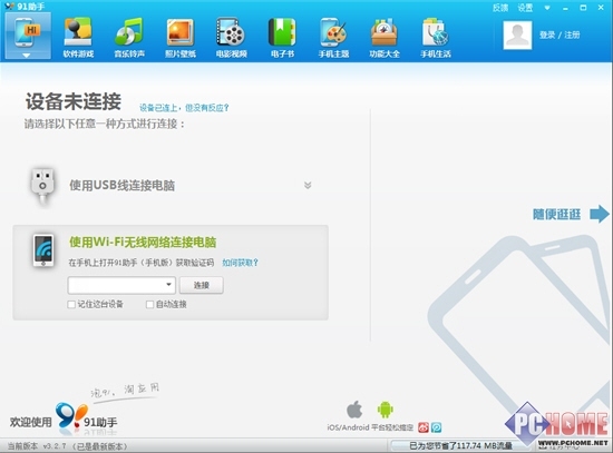 同步助手很早以前已经取消Wifi连接电脑的功能,连接只能用USB数据线,虽然看起来单调了点。