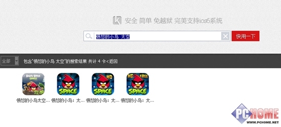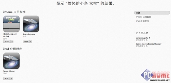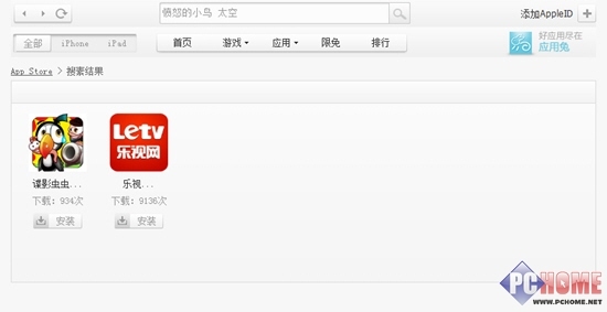 搜索结果不知所云,输入“愤怒的小鸟 太空”后,居然出来两个毫不相关的应用。“愤怒的小鸟”毕竟是iOS平台最火最经典的游戏之一,这样关注度的游戏还搜不到,实在不应该。