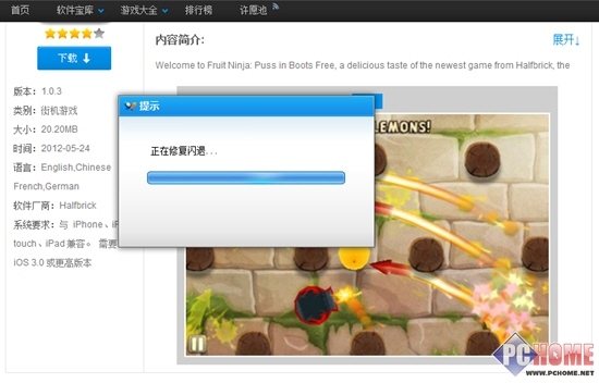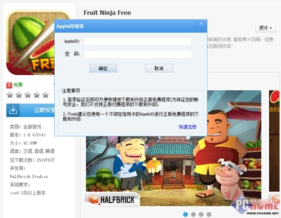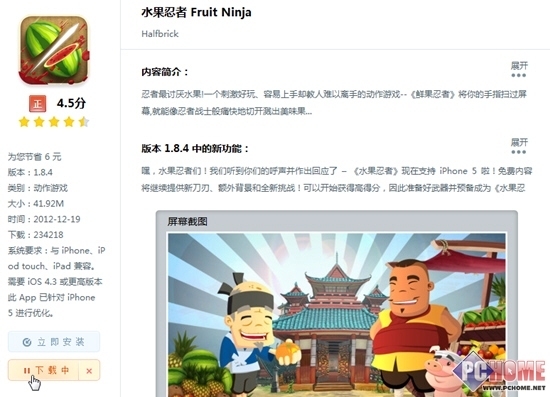 可以免费下载收费的正版水果忍者,点击“正版下载”,把应用添加到下载队列后,就能免费下载原本需要在商店付费下载的应用。这样,用户就可以自由选择付费下载,又或者直接免费下载(如下图)。整个过程不需要输入Apple用户名和密码。(如下图)