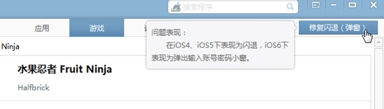 快用苹果助手很清晰地在主界面右上方,提供了闪退与账号密码弹窗的修复功能,只要用户点击,就会弹出修复功能对话框。