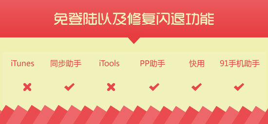 除了iTools声称为了保护用户账号安全,所以不提供绕过登陆Apple ID来下载正版应用的方式之外,其他手机助手都提供了免登陆以及修复应用运行时候闪退的功能。
