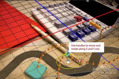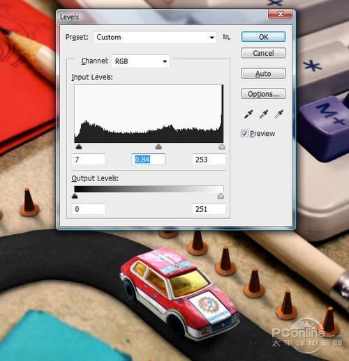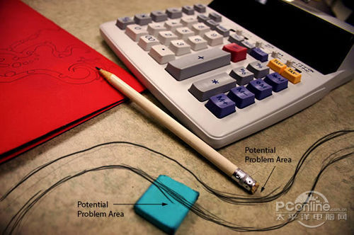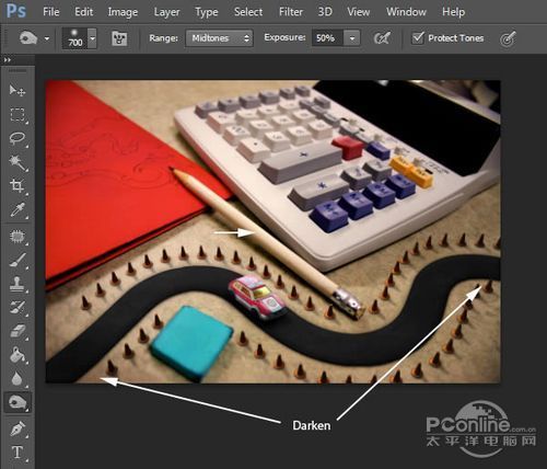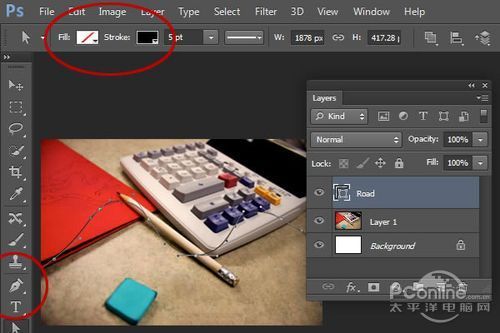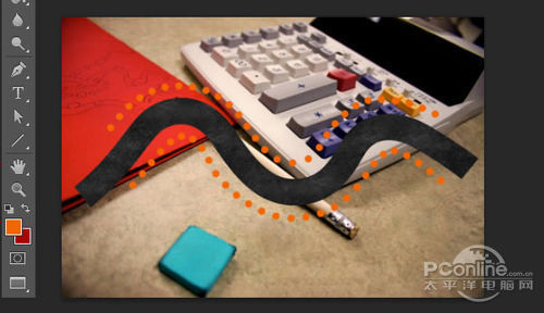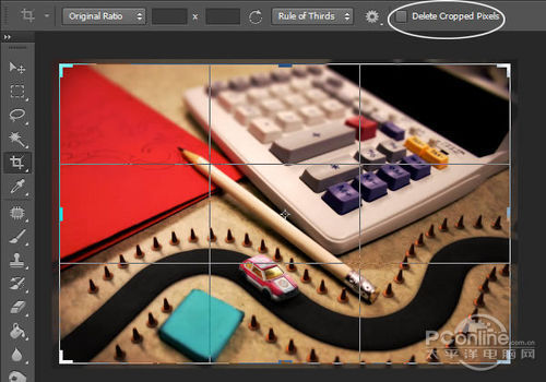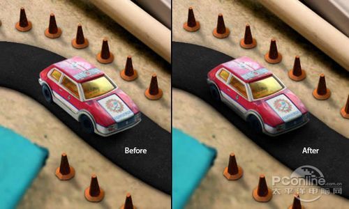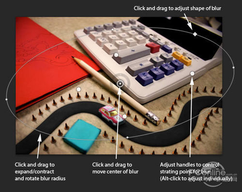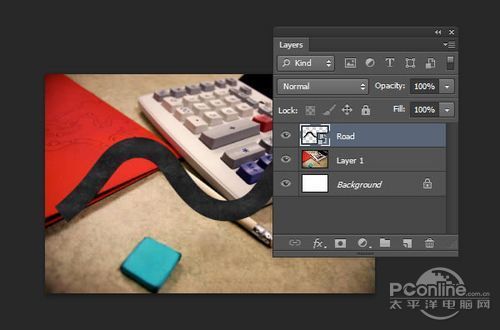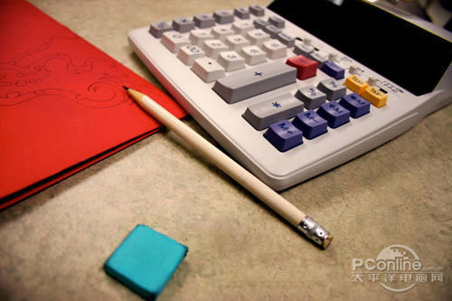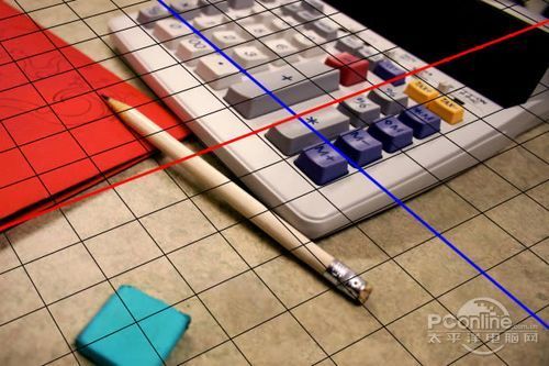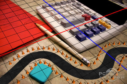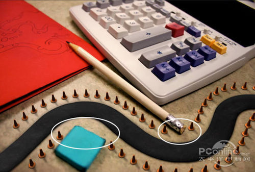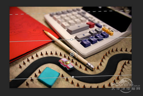 首先打开素材01“桌面”。可以看到这个图片主要由计算器、铅笔和蓝色橡皮擦组成,而图片的边缘已经有虚化效果,应该是相机本身的摄影效果。再看回上面 的最终效果图,会发现“桌面”素材的焦点铅笔和计算机右下角的位置,而笔者设计的焦点是画面中间的宽横带,其他地方都已经虚化,并且模糊效果较“桌面”素 材更加明显。下面,笔者就用“桌面”素材作为背景,逐步添加车行道、玩具汽车、路标。