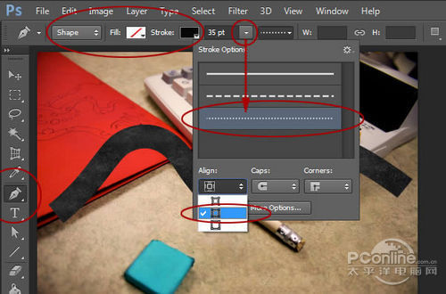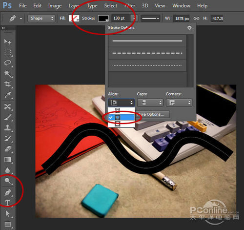 现在,开始调整这条视角是由上至下视觉的车行道。在图层面板,新建图层命名为“Cones”,选择钢笔工具,选择图形模式,设置填充为空白,描边宽度为35像素,描边选项如下图设置。