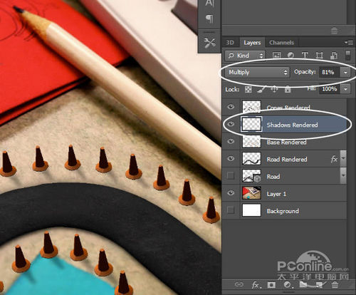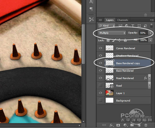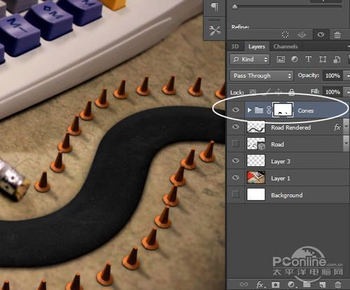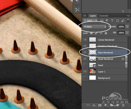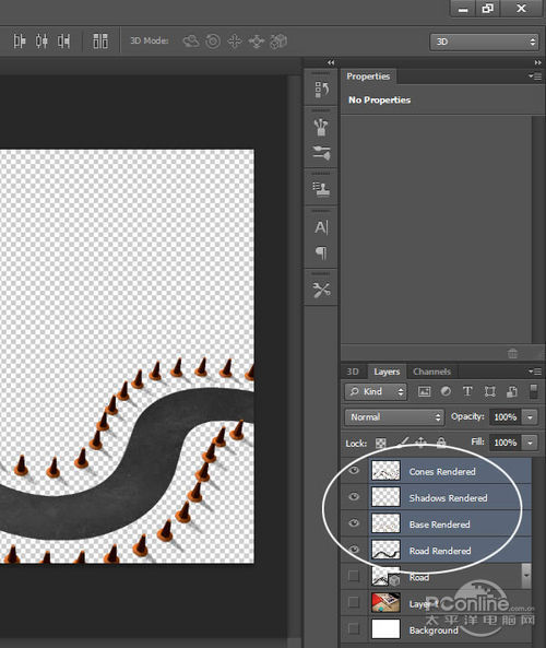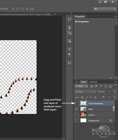 在图层面板(3D图层应该已被选中),按Ctrl+A选择全图,再按Ctrl+C和Ctrl+V复制黏贴渲染的到新图层。将新图层命名为“Cones Rendered”,现在先隐藏这个图层。