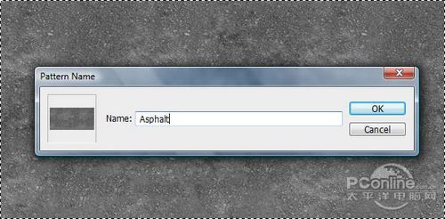 按Ctrl+A将“沥青路面”素材全部选上,然后执行“编辑>自定义图案”,命名为“Asphalt”。然后按Ctrl+C将图像复制到剪贴板,在后面的操作中将会粘贴到前面的画布中。