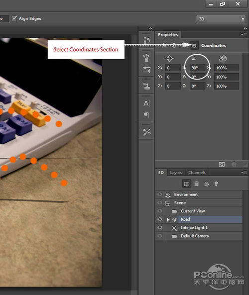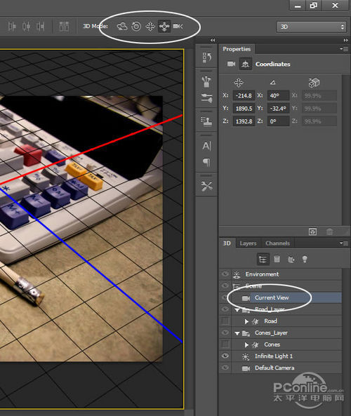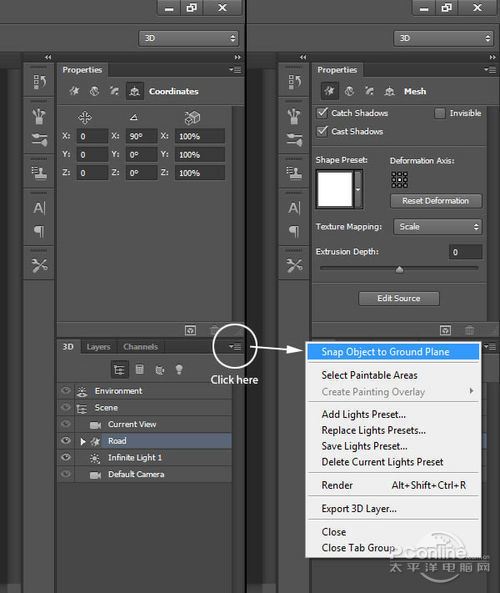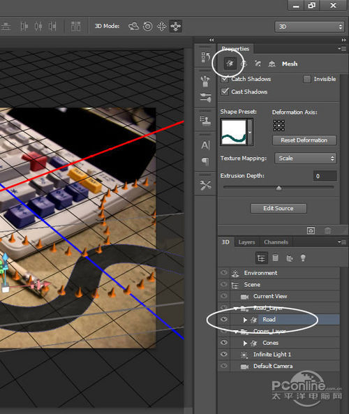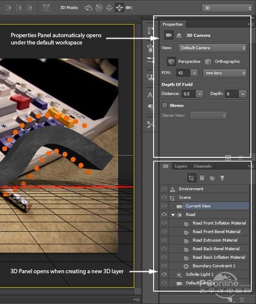路面和路标都准备好后,开始进行3D编辑!选定“Road”图层,执行“3D>从所选图层新建3D 凸出”。这样就会自动生成3D编辑文档,同时打开了3D面板。操作界面如下图所示。