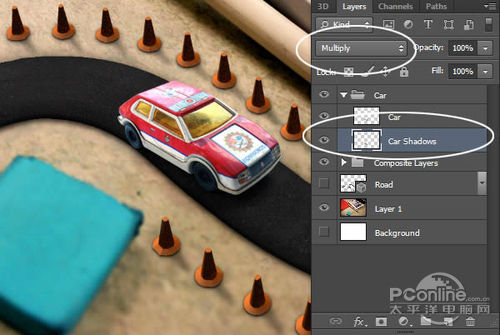 选择图层组“Car”,然后将最底的图层命名为“Car shadows”,改变混合模式为正片叠底。这时汽车看上去,跟周围还不是很协调。再来看看下一步。