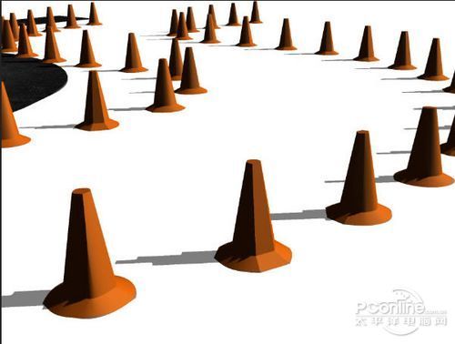 现在车行道和路标都已经渲染好了,下面再对“Cones”增加额外的渲染。将“Cones”显示出来,将“Road”隐藏起来,选中“Cones”,在属性面板的网格选项中,打开透射阴影,打开无形的并关闭透射阴影。
