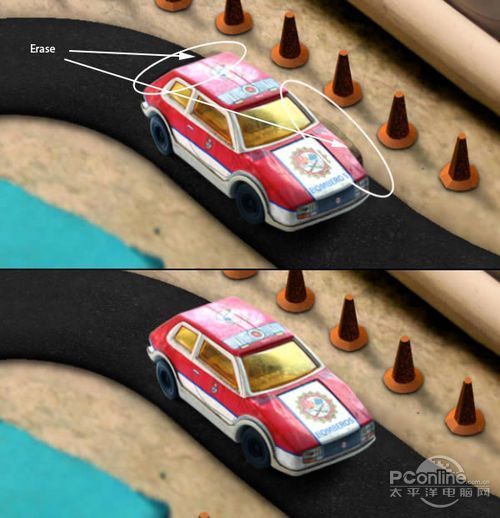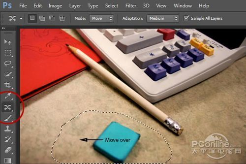 将一个物体从原来的位置移动另外一个位置,不仅要考虑物体在新位置的协调性,而且需要想到原位置如何处理。这里,笔者选择使用Photoshop CS6的新工具:混合工具,它可以在移动物体的同时解决上面的两个问题。选择混合工具,然后用鼠标圈定蓝色橡皮擦周边的范围,再按着鼠标左键向左拖移。这 样蓝色橡皮擦就被“移动”到合适的位置,并且不影响周围的场景。效果如下图所示。