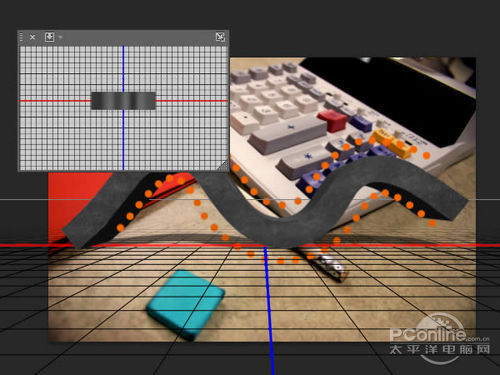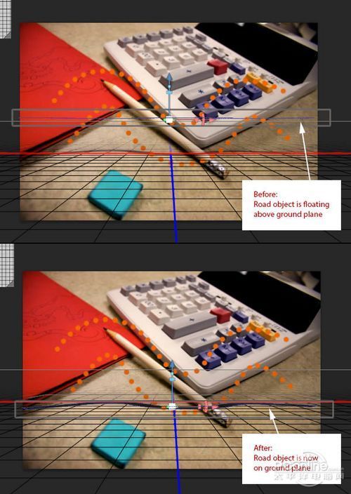 这时将“Road”图层拉回到虚拟的“地面”,效果对比如下图所示。