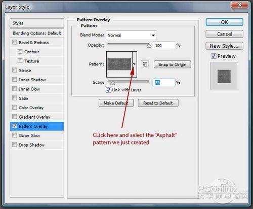回去之前操作的画布,双击“Road”图层,调出图样样式,勾选图案叠加,然后图案选择刚才的“Asphalt”沥青素材,缩放设置为25%。设置如下图所示。