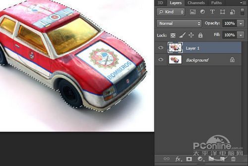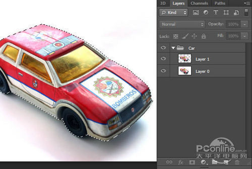 下面就是要将玩具汽车放到车道上啦!打开汽车素材,选择路径模式的钢笔工具,沿着汽车将它轮廓描出。