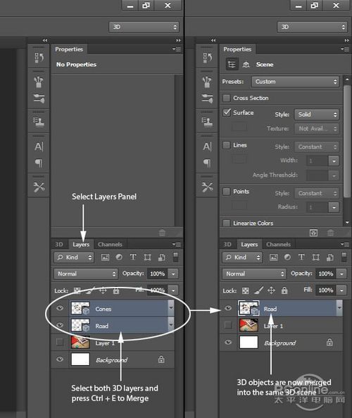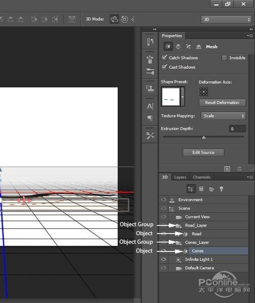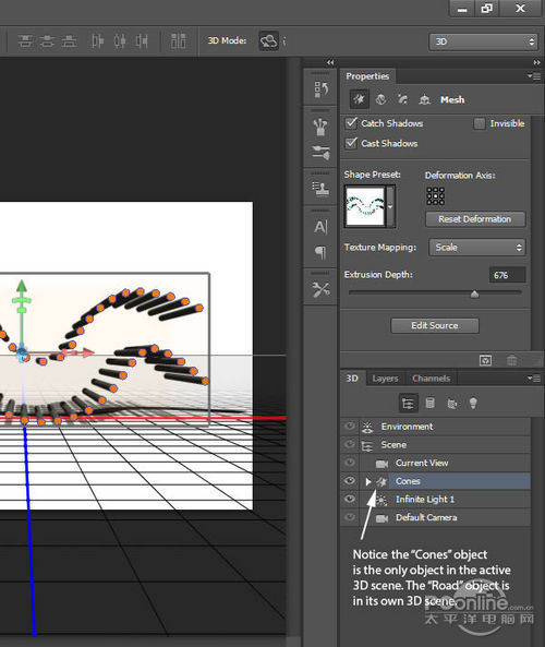在返回图层面板,隐藏背景图像。这样就很容易地看到3D编辑效果。右击“Cones”图层,选择“从所选图层新建3D 凸出”。现在“Cones”是处于独立的网格中,而Photoshop默认对每个图层创建独立分离的3D空间的。所以这里我们需要将“Cones”和 “Road”合并在同一个3D空间内。