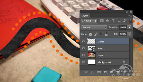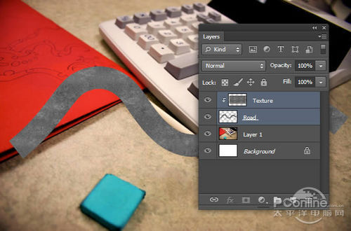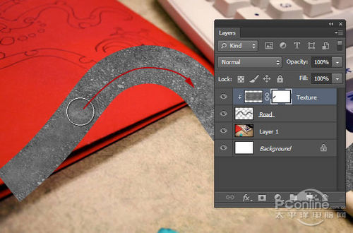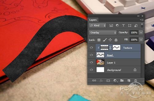 将刚才新建图层命名为“Texture”,然后对着图层按右键,选择创建剪贴蒙版,将“Texture”图层选定为“Road”图层的剪贴蒙版。设置效果如下图所示。