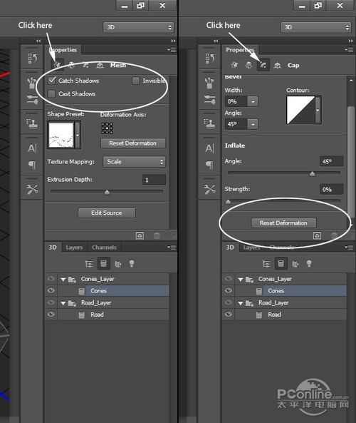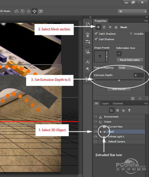 在3D面板中,选择“Road”图层(点击下图所示的星星图标),查看其属性。在属性面板中,确保星星图标已选上,然后设置凸出为0.详细设置如下图所示。