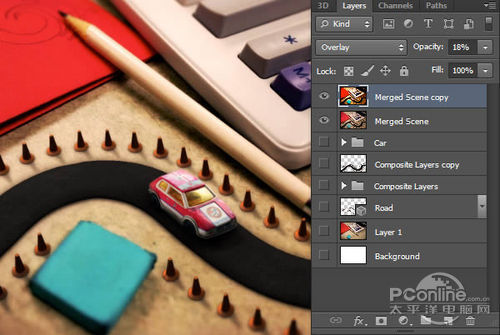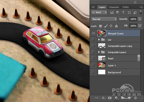 将图层组“Car”拖到桌面场景,然后重新调节它的尺寸,让它看起来和车行道刚刚好适合,效果如下图所示。