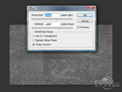 这时“沥青路面”素材差不多处理完毕,但边缘上还与大体的材质不一致。这里选择“滤镜>其他>位移”,如下图调整水平+668、垂直+683、点选折回。设置如下图所示。