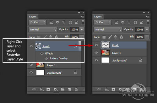 在图层面板中。对着“Road”图层右击,在弹出菜单中选择栅格化图层样式。这样“Road”图层就转为图片模式。设置前后的效果如下图所示。