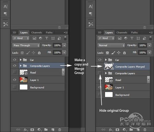 下面就是整个作品的精髓:设置景深!将“Composite Layers”图层组复制一个,然后将其中一个合并为一个图层。操作如下图所示。