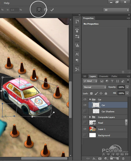 选择“Car”图层,按Ctrl+T,选择扭曲,然后根据周围的场景拖动汽车上的控制点,这一步需要花点时间,效果如下图所示。