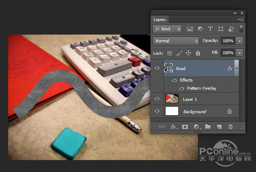 将“Road”图层和“Texture”,然后右击选择转换为智能对象,这样两个图层就转为一个图层,重命名为“Road”。设置效果如下图所示。