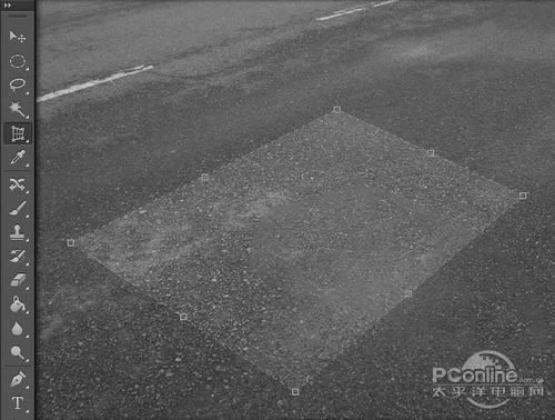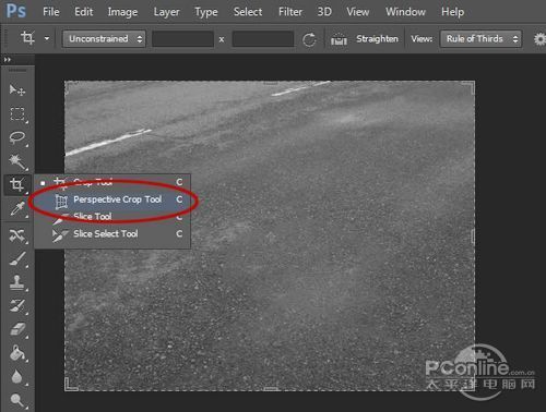 现在路面大致处理完毕,下面就要选取比较合适沥青路面素材作为车行道的路面了。在裁剪工具中点击飞出菜单,选择透视裁剪工具。透视裁剪工具位置如下图所示。