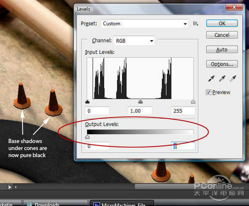 选择“Base Render”图层,将它移到底部,这样就能在路标下显示,然后调整图层色阶至全黑。效果如下图所示。