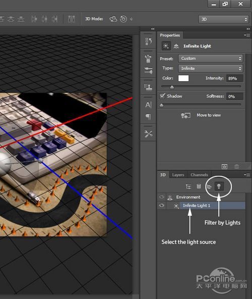 下面就要调整道路的光线。通常3D编辑出来的光线不会完全符合场景的要求。在3D面板中点击光滤镜,选择场景中的一个光线。