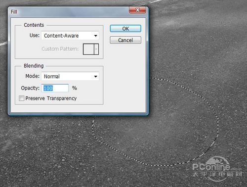 选择套索工具,将沥青马路上的单车标志圈定,然后执行“编辑>填充”,选择内容识别,这样就能将白色单车标志清除掉。如果还有点瑕疵,就用修补工具清理一下。
