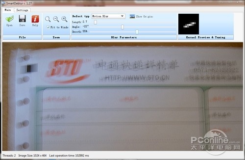 可以看出,虽然SmartDeblur花了很大气力(软件运行时会占用大量CPU资源,且耗时较长,一张1024 px的图片几乎“霸占”了小编这台双核电脑4分多钟时间),可事实上得到的终稿依然无法很好地辨认出其中的文字,甚至连字号已经很大的题头(“申通快递详 情单”)都无法轻松读出,更不用说下面那些小字了。至少在这一点上,SmartDeblur的表现并不怎么令人兴奋。