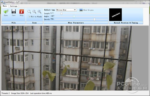 目前最新版SmartDeblur已经升至1.27版,7.05 MB,采用的是绿色软件设计,无须安装只要点击其中一个名为SmartDeblur.exe的小文件就能直接使用。默认情况下SmartDeblur会打开一个DEMO文件,虽然也是张“糊”得可以的照片,但为了避嫌,小编还是决定用自己的相机拍几张。
