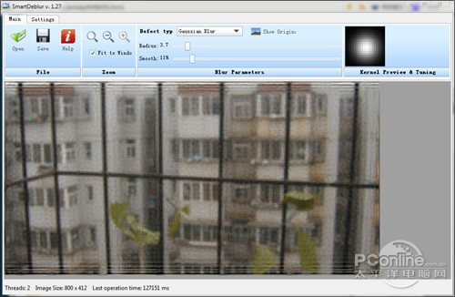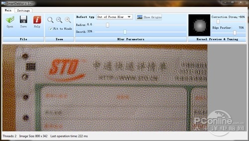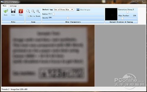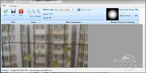 好了,现在该伟大的SmartDeblur上场了。首先我们将“脱焦片”导入软件,然后将“Defect type”(问题类型)设置为“Out of Focus Blur”(失焦模糊),接下来则是来回拖动“Radius”(半径)和“Smooth”(光滑)两个滑块来测试最佳组合。当然在这个过程中,软件是会实 时预览的,因此原则上并没有那么难,最终经过反复测试,笔者得到了一张貌似最好的还原稿。