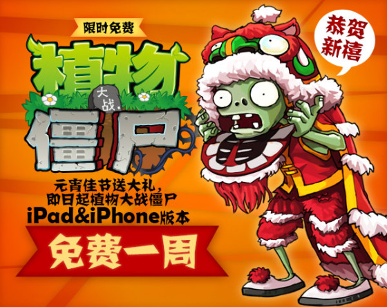 玩家将首次0元尽享原本价值45元(6.99美刀)的ipad版和价值18元(2.99美刀)的iphone版植物大战僵尸!