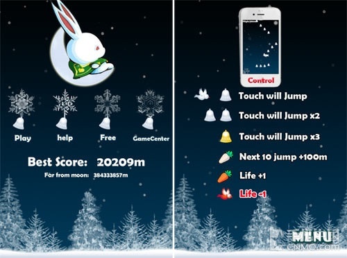 从进入游戏开始,笔者就被游戏简洁的雪夜画面所吸引住了,给人一种童话般的感觉,非常的舒服。游戏的配乐也是以弦乐为主,十分的动听,与故事的 主人翁小白兔相互搭配,实在是太写意了。操控方面很简单,玩家只是需要晃动自己的手机让可爱的小白兔踩在一个个的铃铛上向上攀登即可。