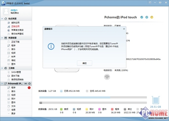 根据PP助手的WiFi开关提示,当用户使用手机助手或者iTunes无线连接电脑后,用完都不会忘记彻底关闭WiFi功能,那么根本不用担心手机上隐私信息遭到泄露。