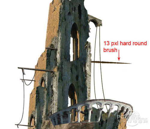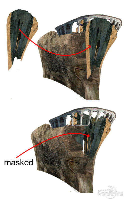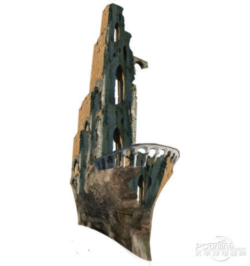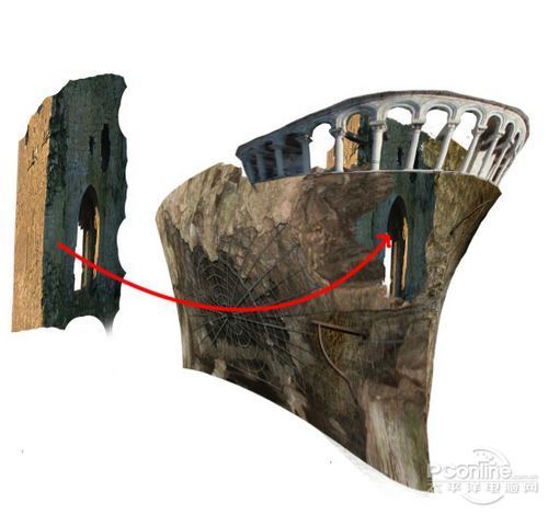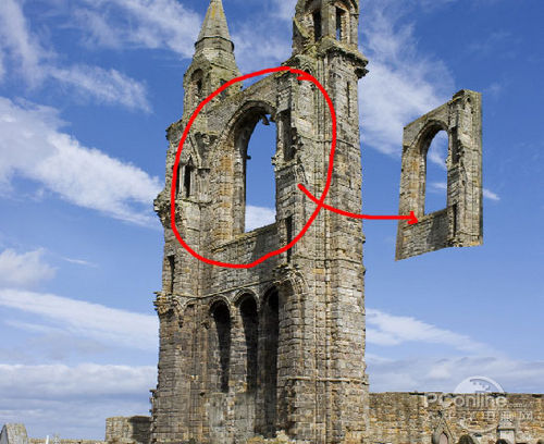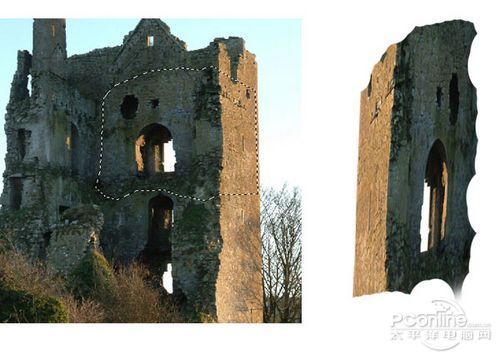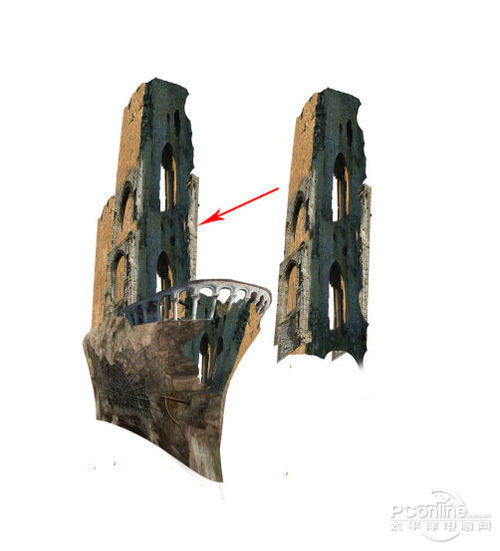 下面继续是素材的处理部分,这次打开“Ruin”素材,然后如下图将部分的墙壁从素材中抠出。