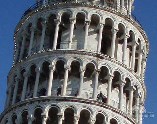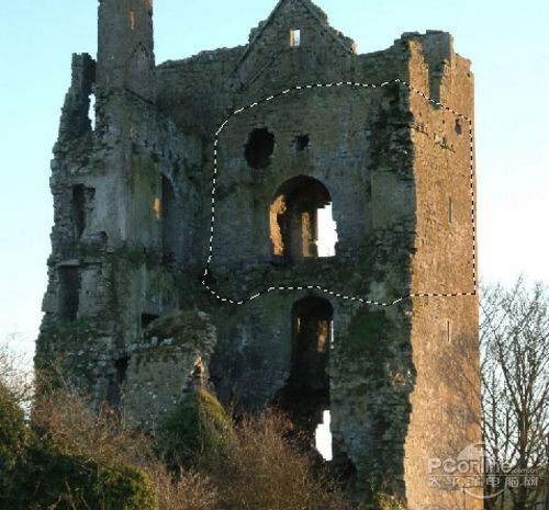 下面打开“Tower”素材,然后如下图所示将选区内的部分抠出。选区范围如下图所示,