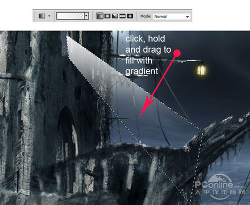 在这一步,将会制作一些月光穿过鬼船。首先在鬼船图层上方新建图层。选择钢笔工具,然后如下图所示选择选区。再选择渐变工具,选择线性渐变,接着如下图所示的方向拖动鼠标,填充渐变到选定区域。设置如下图所示。