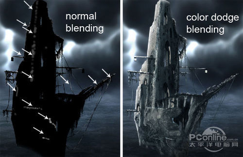 继续新建图层,并以鬼船的轮廓添加图层蒙版,同时将这些图层填充为黑色。将图层的混合模式设置为颜色加深,在这些图层上添加白色,令船身看起来更加光亮。效果对比如下图所示。