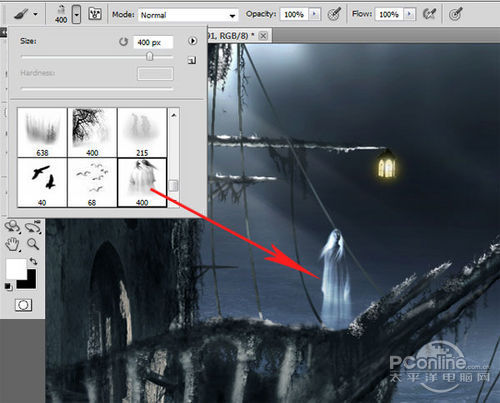 在鬼船图层下面新建图层,选用软笔刷,并设置不透明10-20%。如下图所示绘制一些白光,最后设置图层的混合模式为叠加。绘制和设置效果如下图所示。