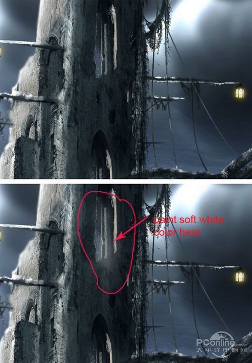 设置光线图层混合模式为正常、不透明为25%。接下来,在光线图层下面继续创建新图层,然后如下图所示在鬼船窗口位置添加白光。效果如下图所示。