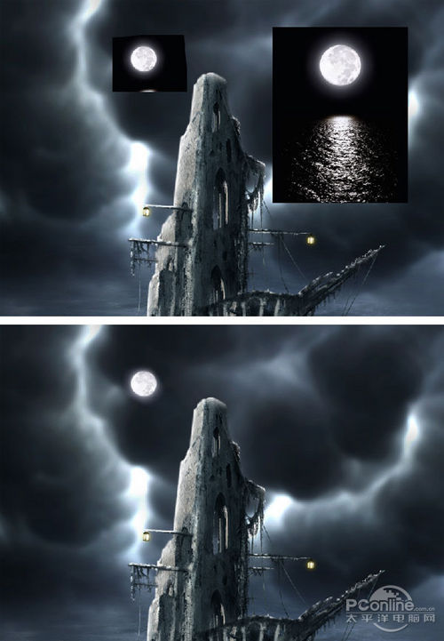 打开“Moon”素材,利用抠图工具将月亮抠出。然后调整月亮的大小,将它放置在鬼船的左上方,设置月亮图层的图层混合模式为屏幕、不透明度为100%。效果如下图所示。