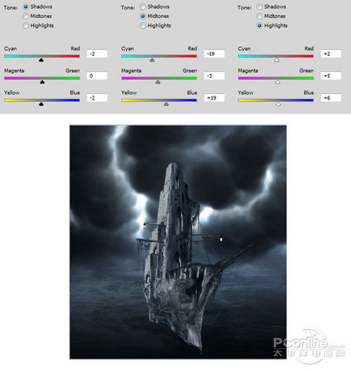 下面同样添加色彩平衡调整图层,具体设置和设置效果图如下图所示。
