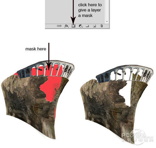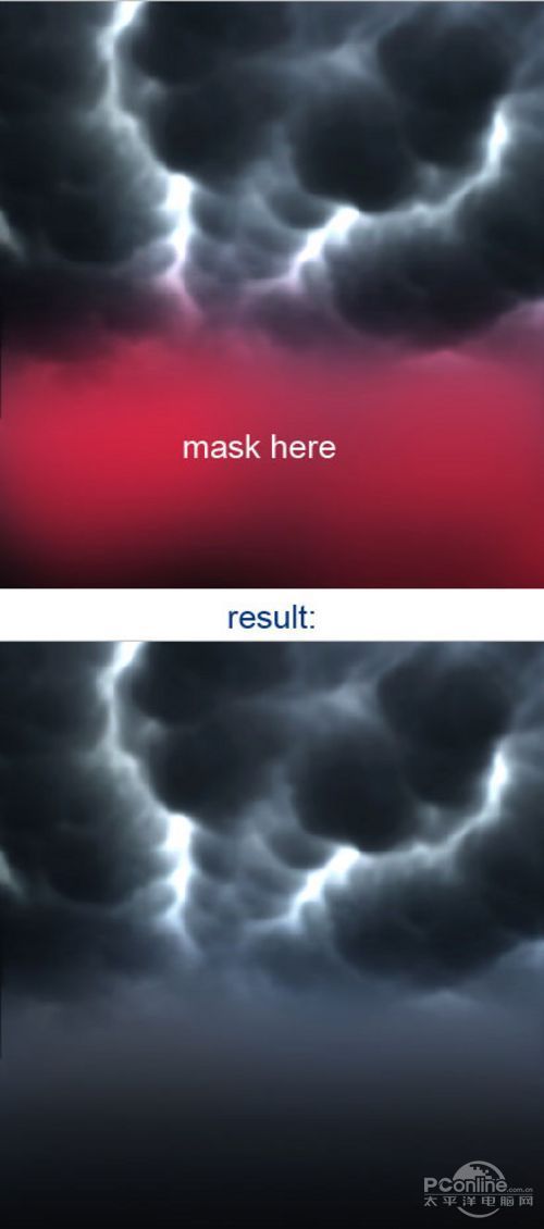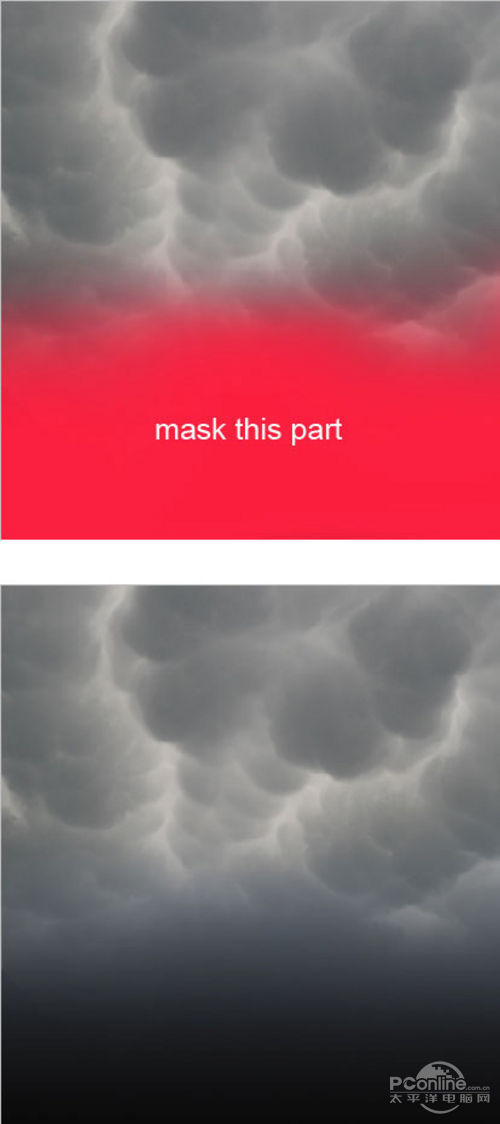 将刚才两个图层都选定,然后按Ctrl+E将它们合并在一个图层,并用图层蒙版和笔刷工具将下图所示的部分遮蔽。