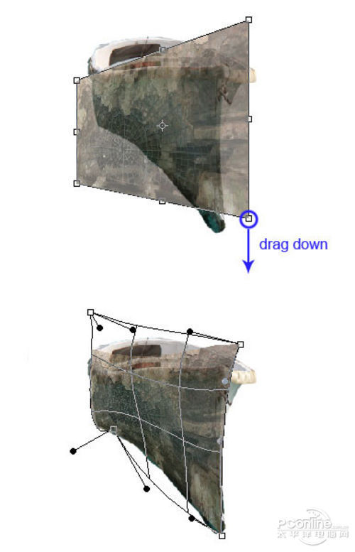 同样选定“Web”素材按Ctrl+T调出自由变换菜单,然后选择透视。如下图所示,拖移右下角的控制点,以尽可能贴近船身形状。再选择变形,将蜘蛛网覆盖在船身上面。