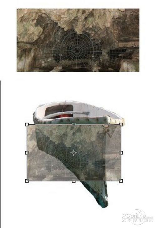 同理调出自由变换菜单,跟蜘蛛网的调整方法一样,将“墙壁”贴在船头的位置。调整效果如下图所示。
